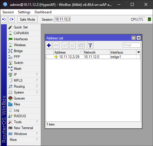 At this point, the device will have no IP address and need to be accessed via the MAC address using Mikrotik’s WinBox program. Upon connection, follow the prompt and set a new password; with that done, navigate to the bridge menu. Here we will add all ethernet ports into the default bridge. Then go to the IP menu and open addresses. Add an address here to the default bridge. Do not use an address that is in your existing IP subnet. We will want to use routing to direct packets, and so we will need a transport IP network. This will only need a few IPs, so use a small subnet like a /29. In this example, we will be using 10.11.12.0/29 for transport. In this case, assign 10.11.12.2 to the bridge for our access point. Here you might ask why we do not use the .1 address, and this is because we need an IP for the source and destination networks.