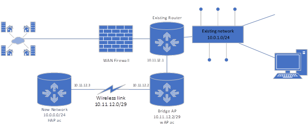 Let’s go over the basic setup for this application. We will need two Mikrotik wireless devices to establish a point-to-point link. In this example, we will be using a wAP ac and an hAP ac. The first device will be the access point and the second the station. The second device will also provide the wired connections for the remote network, so we use the hAP as it has 5 ethernet ports.