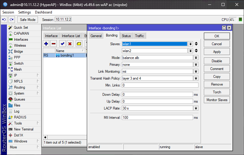 Your WinBox session will be disconnected after this, but you can reconnect either with the MAC or to the IP address we just set if we add the network information to the interface we are connecting from. The next step is to establish a bonding interface to aggregate the 2.4 and 5ghz networks. Open the interfaces menu, click the + to create a new interface, and select bonding from the drop-down. Select WLAN 1 and WLAN 2 as the slaves. Set the mode to balance alb for best performance. Link monitoring should be set to mii. Now go back to the bridge menu and add this new bonding interface to the default bridge.