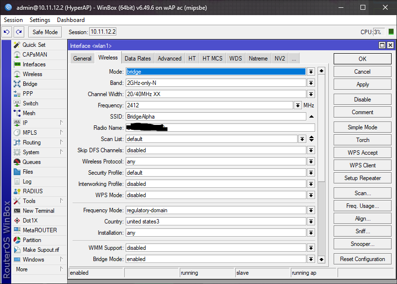 Setup on the hAP ac will be similar but not identical. The first change is that we will want to make 2 bridges. The first bridge will be for the transport network, and the second will be for the destination network. Add the IPs to the two new bridges you just created. In this example, the first bridge will be 10.11.12.3, and the IP for our destination network is 10.0.0.1/24. Create a bonding interface containing both WLANs, add it to the first bridge, and add all ethernet ports to the second bridge. Configuration of the wireless interfaces is identical except now choose the mode “station bridge.” If everything is working, you will see this device connected to the previously configured access point.